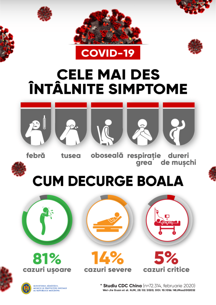 Cele mai des întîlnite simptome ale COVID-19 sunt febra, oboseala și tusea uscată. Unii pacienți pot prezenta dureri, congestie nazală, nas curgător, dureri în gât sau diaree. Aceste simptome sunt de obicei ușoare și încep treptat. Unele persoane se infectează, dar nu dezvoltă niciun simptom și se simt bine. Majoritatea oamenilor (aproximativ 80%) s-au tratat fără un tratament special. Aproximativ 1 din 6 persoane cu COVID-19 devine grav bolnavă și prezintă dificultăți de respirație. Persoanele în vârstă, precum și cele cu probleme medicale, cum ar fi hipertensiunea arterială, probleme cardiace sau diabet, sunt mai susceptibile să dezvolte o evoluție mai gravă a bolii. Aproximativ 2% dintre persoanele bolnave au decedat. Persoanele cu febră, tuse și dificultăți de respirație trebuie să solicite ajutor medical.